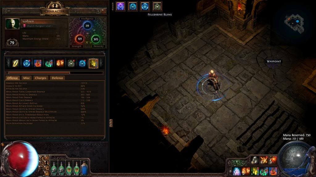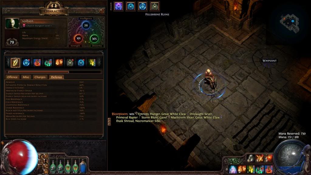 Update last build. http://www.pathofexile.com/passive-skill-tree/AAAAAgIAAW8B0QW1BfkILgx9DPIOSA6tEHsQfxEvEZYUdRXXFfAZjhm0HNwhdij6KaUrCiymLL8s6TB8Mfo0CjY9N2Y8jj7PRnFHBlFHVmNW-lfJX2puaXBScNV0QXb3d9d_K3_GhEiGrohrjb-TJ5UgmZqbjaJApcum66c0p9Sr0q_rtAy0xbb3uJO95r46vqfAUcEAwcXC7MNtxKLEuMaeyqnK082Y1fjXhtsa3BXdDd7G44TqYutj6-7sGPT49Uv5Y_qx_MX-yA== Comment to this reset passive skill. 1/ Before reset passive skill, i think i will loose many rather much ( lost 28% max mana + 40% mana regen) so i can use only 3 aura only. After reset, mana from 1180 down to 981 and mana regen from 54 mana/sec down to 35 mana/sec and i realise i can use not only 3 but 4 auras, so i try to use clarity again. After using 4 auras, my mana remains 251/981 with 73 mana/s, so its good result for me. 2/ I can say that Inner Force is one of the best passive skill node. With Inner Force, my armor is 9k4, before that it was 8k4, my default damage per second from ~ 560 to 687 and i think my es become better too. When i use clarity, my mana from 191 increase to 251... 3/ My gear is still the same before b/c i still can not find good es armor. 4/ I believe motel shell is good buff for me so i choose it. And Warlord mark is not bad choice. 3/ You can watch below pictures after reset passive skil.
