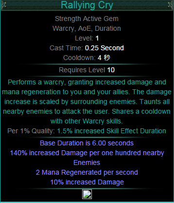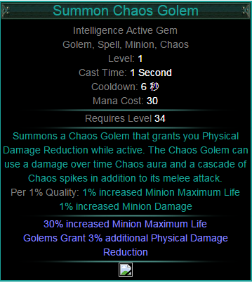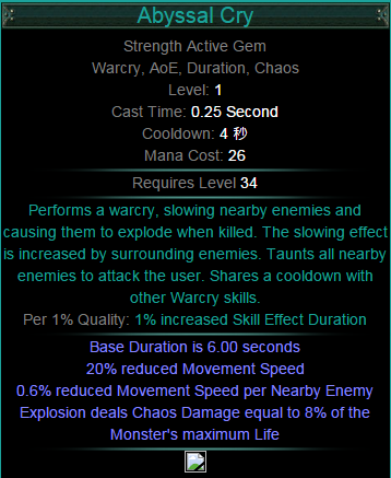 Rallying Cry - Link ![]() Thoughts: Probably not going to replace flesh offering as that skill is more of a consistent damage boost but this does seem like a worthy enough to warrant a slot you have have one. Not much else to say but a straight up damage boost to your minions and granting yourself some mana regen. As the numbers are now at level 20 with maybe 20ish mobs that u can land this skill on you can gain about a 50% damage boost. For all your minions and teammates. Honestly not a bad skill as you move from pack to pack. Base duration is 6s which is kinda sweet once tack on some duration stats Abyssmal Cry - Link ![]() Thoughts: This is interesting. I wonder if you could grab chaos damage stat and boost the damage since your casting the skill. If you combine this with the Grasp you can deal 28% of the mobs life as an AOE explosion. That is pretty good. The slow utility is also helpful. This is one of those skills where it needs testing before you can tell if its good. Summon Chaos Golem - Link ![]() Thoughts: Buff wise it seems like the only Gems - Support