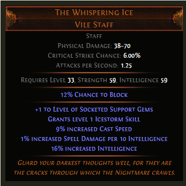 The Whispering Ice - Link ![]() Thoughts: A spell that can compliment minions nicely. As far as I know it leaves a chill ground that slows enemies by 30% which can stack with temporal chains resulting in a very nice utility. Staff also functions as a double 6L so you can 6L your Icestorm skill with a spell based spectre. It also scales with Int and summoner builds generally have a lot of travel nodes invested in int. Sire of Shards - Link ![]() Thoughts: This staff alone creates a lot more variety when it comes to spectre choices. It will be a 7L that grants projectile based spectre/or golems the ability to deal AOE around them. Definitely a lot of potential here when combined with some kind of movement skill + convocation in to a pack. Jewels