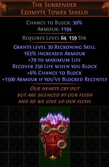 However, we still need damage scaling, or else our damage against bosses will leave something to be desired. To this end, we scale bleed, which has many applicable nodes in the duelist starting zone and in the champion ascendancy tree, and which and which has many opportunities for damage scaling through double-dipping. Update: gear so far in Hardcore Breach: Decided not to take "fending" passives, just using Lion's Roar instead. Chose to use Hatred instead of Grace - need the extra damage, and the extra tankiness is not really needed. Not yet running AA - will need to test and see if mana becomes an issue with 75% reserved. As of right now I'm facerolling through maps in HC breach. The new unique shield introduced in 2.5 is also really good for this build, basically an upgraded Lioneye's without an MS penalty. use it if you can get it; I'm not, yet. Planned passives tree by level 80: Continue into this: Bandits: Oak(+40 HP) Oak(+16% physical damage) Kraitlyn(+1 frenzy charge) Equipment: Lightning coil (For the Physical Damage Reduction) Lioneye's Remorse (For the Armor, Life and Block Chance) High pDPS Dragoon Sword (because of the %chance to bleed) The Anvil (For the block chance); eventually upgrade into +1 curse corrupted version Rare items for the rest. Make sure to get at least one of both life and mana leech items. Mana reservation: Arctic Armor(25%) Hatred (50%) Defenses: Block: in the passives tree we gain a total of 27% increased chance to block with shields. Add Tempest Shield and the Anvil on top of this, and the increase is at 40%. Lioneye's remorse has a 30% base chance to block, putting us at 70% chance to block attacks and spells; when Painforged procs, this goes up to the absolute maximum (with The Anvil's 3% increase) to 78%. Of course, we pick up tons of life and life regen, as well as endurance charges, in the left side of the tree. Lightning coil reduces our physical damage taken by 22.5%, Blood in the Eyes by 6%, endurance charges by 20%. We also have good armor value, not only from our rare equipment and Coil, but from double scaling the armor on Lioneye's Remorse with shield defenses nodes. Combining evasion rating from rare items and Coil with Grace and Enfeeble (once we get +1 curse Anvil) gives us pretty effective evasion chances as well. Finally, degeneration damage is countered by our insane life regen values, which can reach over 8%. Offenses: As stated above, the build is centered around scaling Bleeding damage. This is the reason a lot of choices that may strike readers as odd (such as Oak in cruel, Grace over Hatred, and Fending) are taken. Gem Links: Blade Flurry Faster Attacks Melee Physical Damage Fortify Increased Area of Effect / Concentrated Effect Rapid Decay Even before bleed, we have quite respectable damage with Blade Flurry, clocking in at 364% increased area melee physical damage with swords from the passives tree. If we combine the bleed chances from Gratuitous Violence and Blood in the Eyes with the 8% chance for melee attacks to cause Bleeding near Bloodletting and a Dragoon Sword's passive, we get a total of 70% chance to cause bleeding on attacks. In addition, Fending pushes enemies back, moving them forcibly and thus causing more damage. We then scale this bleeding damage with... 30% increased damage against bleeding enemies (Gratuitous Violence) 30% increased damage against bleeding enemies (Blood in the Eyes) 32% increased physical damage (Path of the Warrior, small nodes in Ascendancy Tree) 50% increased physical damage over time (Bloodletting cluster) 24% increased physical damage (Rustic Sash) 20% increased area damage (Amplify) (Yes, this does double dip.) 16% increased physical damage (Cruel Oak reward) 45% - 3 Jewels with %Physical damage mods; ideal jewel is a 3/4 prop with this mod, life, and 1 or 2 more damage mods 39% more damage with damage over time (Rapid Decay) 16% more damage (4 frenzy charges) ... Leading to a total of %398 increased Bleeding Damage against ordinary mobs (in other words, about five times the normal damage with bleeding). Keep in mind that we're also forcing movement with Fending, causing the 50% DoT instead of the 10%. Against bosses, we also use Concentrated Effect and Vulnerability, leading to 762% increased bleeding damage, plus the buffed base damage leading to stronger bleeds, even when the reduced effect of curses against bosses is taken into account. Lightning trap could also be used to create shocked ground, leading to a total damage increase of about 1058%, but that's a bit too involved for my taste (and probably not necessary.) Of course, keep in mind that this is still all a function of your original attack damage, which is dealt with a one-handed, non-crit weapon. For this reason you have to find the highest pDPS weapon you possibly can; do not settle for less than 320. Final thoughts: Shield Charge and Leap Slam for movement. You'd probably hardcast Bloodrage and Enduring Cry. Reckoning is a given, with some damage/leech links. Tempest Shield, Enfeeble, Molten Shell on CWDT. Flame golem if it won't be a liability (would actually buff your bleed some more, though I didn't bother to include it in the calculations). You could also try using The Scourge unique claw, though I'm dubious as to whether the 70% global damage is worth the terrible weapon damage. There's probably more that you can do to scale the bleeding that I haven't said here; figuring that out will be part of the fun of playing the build for me. I look forward to the new league coming out so that I can try out this character. Last edited by HHHHHH#5699 on Dec 4, 2016, 5:00:33 AM Last bumped on Apr 12, 2017, 9:48:16 PM