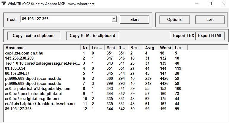 I ran WinMTR on the instance I was in, here's the result: ![]() If I'm reading it right, the latency occurs because of the servers that end in "t-ipconnect.de", which belong to a german ISP. Is there any way for me to work around this? Anything I can solve on my end, or is it just an issue with the server provider the game uses? Any help would be greatly appreciated. Last bumped on Jul 24, 2021, 10:07:55 PM