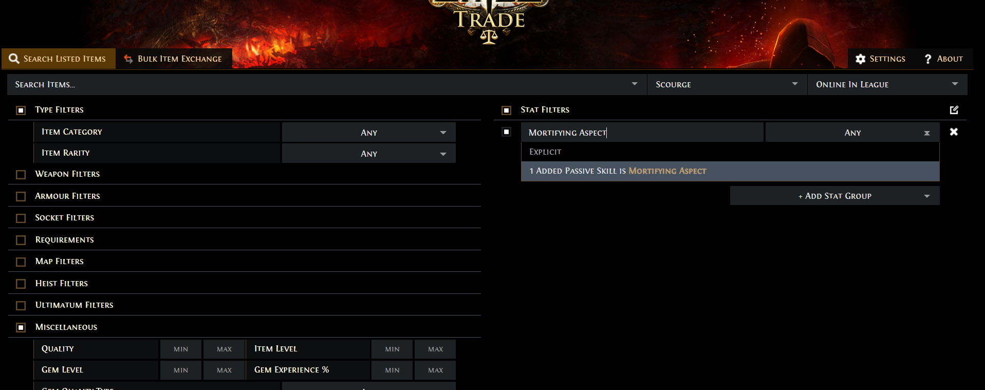 While I was trying to look for cluster jewels with Mortifying Aspect(which is newly added this league), I found that the passive cannot be searched as below: