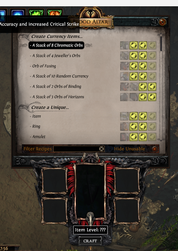 I tried to use he blood altar but I have a weird message whatever I try and I'm totally blocked. ![]() When I click on "Item level", I have this message: The item level of the resultant is based on the Beast in the top-left slot It's empty and even if I want to generate chromatic orbs it doesn't work. Any clue? I restart game, computer already. No change Just stuck... Thanks! Last edited by mariole75#4227 on Aug 17, 2024, 12:12:53 PM Last bumped on Aug 18, 2024, 12:23:45 AM