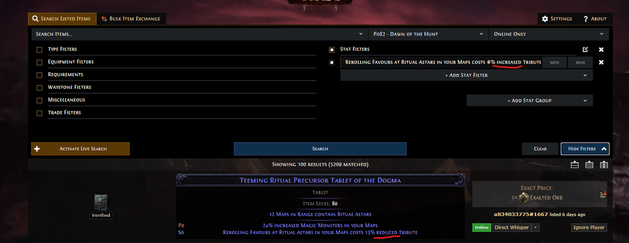The screenshots say it all. Instead of reducing the rerolling cost, the tablet is exponentially increasing it. (Also note the discrepancy between the filter description of the modifier and the description on actual item)