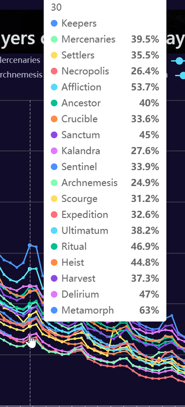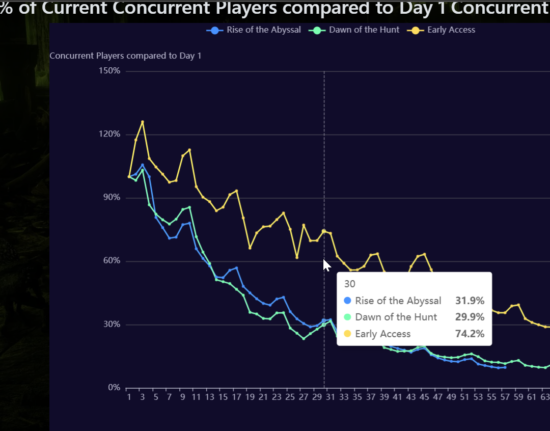 " 1) Valdo runners cannot oneshot ghosted feared with 100% delirious and 90% less damage dealt (they usually out their amulet/ring off). They need to fight them kiting dangerous bosses and consider layout. If you're interested, you can check Bigdaddy's channel. He is a great content maker and often run valdos. 2) Its not true, while greatest peak retention rate leagues like ritual and affliction held 50%+ of players till day 30, poe2 had 29% during devastating dawn of the hunt and 32% during 0.3 which is not nerf fiesta but nice content patch. Also we can take free holidays in account. still game lacks proper endgame and thats why people leave: ![]() Also, 0.1 was fun with temporalis, tempest flurry, farming sekhema and ultimatum for loot and giga juiced maps. + overall hype. No wonder its numbers are shocking. Afflicton and ritual stats: ![]() Last edited by SoColdO_O#1989 on Nov 27, 2025, 12:20:07 PM