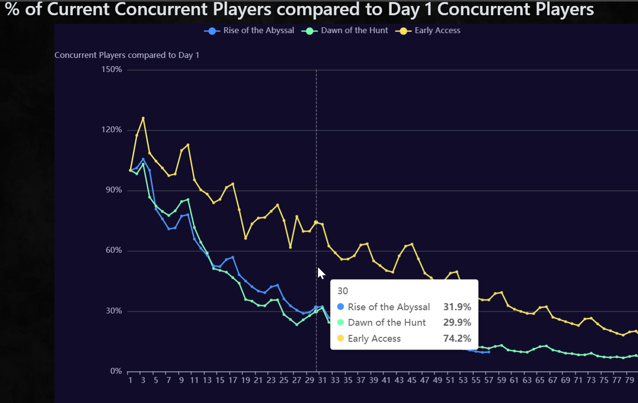 " Lol. I guess you should tell the same thing for TS, as he mentioned poe2 online number, so I presented player retention rate stats in % of initial online, not raw numbers. Poe2 gained its audience because of Poe1 being absolute king of ARPG genre. With it being both complex and fun. If poe2 was called "dungeon of dwarves new hardcore arpg for true hardcore meaningful combat lovers" trust me NO ONE WOULD HAVE PLAYED IN AFTER 0.2 and especially if its game director showed middle finger to his audience during interview and said, quote: "People who dislike poe2 just don't know how to play this game as they are poe1 players" (c) Jonathan Rodgers during interview with some diablo guys. By the way, Jonathan also promised to stream us how he pushed to endgame with parry huntress. I do not hate Jonathan and don't want to offend him in any way, as there is nothing wrong in making mistakes. At least he recognized the mistake (the vision) and chose right path in 0.3. By the way, I see completely no point is arguing with people who say that online number doesn't matter. If you go against the opinion of the majority of playerbase who enjoy fun, you want to ruin the game. It's a fact. And with people who say that poe2 attracted people because of "different gameplay than poe1" whereas 0.1 with 70% player retention rate was the most poe1 thing poe2 ever been. With zoomy builds and juicy drops. ![]() Last edited by SoColdO_O#1989 on Nov 28, 2025, 11:51:17 AM