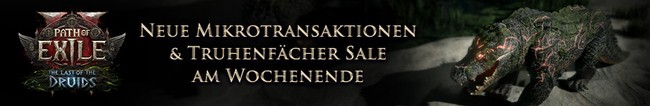 Neue Path of Exile 2 MikrotransaktionenDiese Woche haben wir einige neue Mikrotransaktionen in Path of Exile 2 veröffentlicht, inklusive Rüstungssets, Fertigkeitseffekte und Gestaltwandler-Effekte! Seht euch einige der Videos unten an und sichert euch eure Mikrotransaktionen hier, oder indem ihr während ihr euch im Spiel befindet “M” drückt, um zum Shop zu gelangen.Krokolisk-RüstungssetSchildkröten-StabskinKrokolisk-Bär-Gestaltwandler-SkinKrokolisk-Lindwurm-Gestaltwandler-SkinKrokolisk-Wolf-Gestaltwandler-SkinLindwurm-Fledermaus-Gestaltwandler-Skin”Vaal Chronoseher”-Rüstungsset”Abgründiger Tornado”-Fertigkeiteneffekt”Leuchtender Tornado”-FertigkeiteneffektTruhenfächer Sale am WochenendeDieses Wochenende veranstalten wir einen Sale auf Truhenfächer, bei dem jede Art von Truhenfach im Angebot ist! Ihr könnt die vollständige Auswahl der im Angebot erhältlichen Truhenfächer hier einsehen. Der Sale auf Truhenfächer endet am Dec 22, 2025 7:00 PM (EST) (angegeben in eurer lokalen Zeitzone).Danke für eure Unterstützung! |