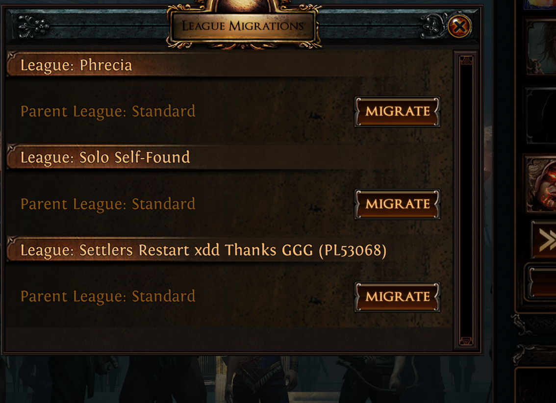 " For your case, just click migrate Phrecia to Standard ? (it is Phrecia 1.0, right? The bottom private league you can also migrate it) This is the start of forum signature: I am not a GGG employee. About the username: Did you know Kowloon Gundam is made in Neo Hong Kong?
