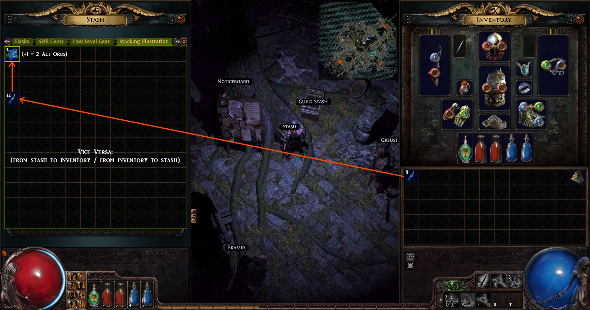 " When a new alt is created, I do merge it with any existing stacks. However, I like that this is something that I have to consciously do. I may have 5-10 non full stacks of alts sitting around and if the new alt was automerged I may not even notice. But if a new alt is sitting in its own spot, it is like the game is telling me "hey, you just acquired a new alteration". " The thing is, I actually like manually moving things around. To me it a sort of book keeping. " If I ctrl+click a chaos orb into my stash, it will automatically join the top leftmost nonfull chaos orb stack, or if that isn't available, the top leftmost empty slot. If I ctrl+click alt shards into my stash, and there are more than 20 shards in a stack, the shards become an orb. Unless there are exactly 20 shards, there are now two new items in my stash as a result of that one action: there is an alt, and there is a stack of shards. It doesn't make sense for the alt to join another stack because the alt is the direct result of shards being placed into that particular slot, and it should occupy the same slot that its 'parent' shards occupied while they were still shards. Another perspective: the 'auto-stack' mechanic only occurs when I ctrl+click from stash to inventory or vice versa. I didn't ctrl click an alt into my stash. I ctrl clicked a stack of shards. They should be auto-stacked, but not the orb. As for the leftover shards, I ctrl clicked those into the stash, ctrl clicking should perform a definite action for each item and I see the shards that make up the alt and the leftover shards as distinct item. Same as if you ctrl click a stack of 10 jewelers and there is a stack of 15 in the stash already. 5 join the old stack, 5 take the position they would have taken if they had been ctrl clicked when there were no non-full stacks to fill. I guess overall it is a matter of consistency. I don't believe that the one special case of shards forming an orb warrants special behavior. Last edited by BigRussianDude#5009 on Aug 20, 2013, 2:50:19 AM