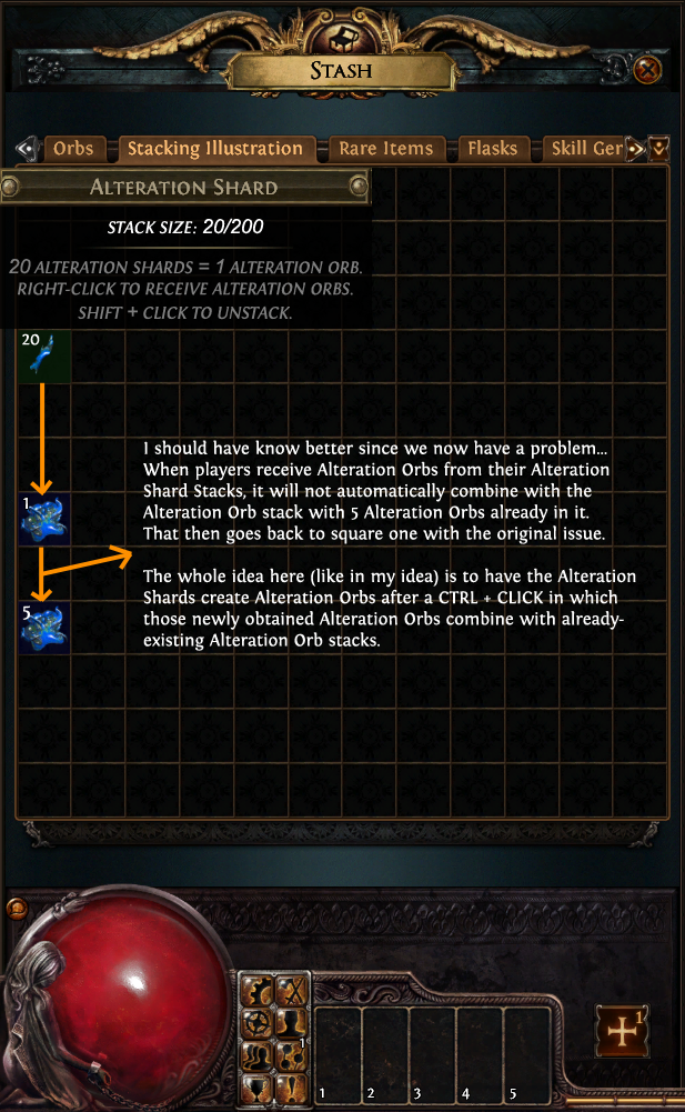 In addition to his idea, I am going to improve it by translating it into an illustration where if players have 40, 80, or 100 Alt Shards accumulated out of 200 Alt Shards, players will be able to obtain 2, 4, or 5 Alt Orbs at a time with a single right-click vs. obtaining one Alt Orb with every right-click. Therefore, if players have 200/200 Alt Shards accumulated, the whole Alt Shard stack turns into 10 Alt Orbs automatically. However, if players only have 38/200 Alt Shards, they're only going to receive 1 Alt Orb with a single right-click. Due to finding multiple problems with SoylentJello's idea while creating the illustration...