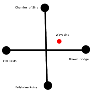 Follow the road from the start - it leads directly to the waypoint. It can't be more than 30 seconds run. Since it's the road you will probably meet less than 20 mobs total. From the waypoint both Fellshrine and Broken bridge can be run to in less than 10 seconds. Chamber of sins is a bit longer cos there is an unique boss on the way, probably 40 secs - 1 minute. As someone with a crap machine I agree that crossroads takes forever to generate, I have lost 2 hardcore characters(one was lvl40) when teleporting there and when the load finishes I see my character lying dead and 2 white monkeys around him. |